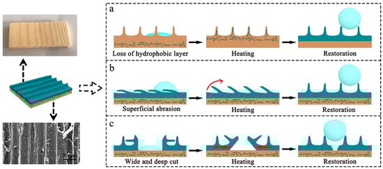 Second approach: recovery of hydrophobic properties is due to regeneration of the micro/nano hierarchy [76]. Self-recovering SHCs based on the recovery of structural damage have been successfully fabricated by spraying the mixture of polymethylmethacrylate(PMMA)/zinc stearate(ZNO)/stearic acid(STA) on the wood surface [77]. The damaged coatings were soaked in water, followed by the infiltration of water into the damaged structure, and then induced swell of PMMA to restore the topographic features which were compressed during scouring. When the water in the coatings is evaporated and leaves the air hole again; therefore, the coatings recover the superhydrophobicity. By acid rain (pH ≈ 3.5) scouring, the coatings restored superhydrophobicity after immersion in water for 30 min. Coatings are still superhydrophobic within the process repeated four times. In contrast to most conventional self-healing surfaces, the superhydrophobic surface prepared by Jia et al. could restore wide and deep cuts by the healable conveyance method [78]. By assembling layered bismuth oxychloride (BiOCl) nanomaterials and hydrophobic perfluorooctyltriethoxysilane (PFOTS) layers on a wood substrate, PFOTS molecules could break the energy gap and migrate to the damaged surface by a simple heating treatment. Then, PFOTS molecules readily reacted with hydroxyl groups of ethanol and regenerated a new hydrophobic PFOTS layer. The fibers could deliver the superhydrophobic coating to the damaged area in Figure 8. In this way, the incision was reduced and filled, thus regenerating the superhydrophobicity. The obtained self-healing superhydrophobic surfaces with photocatalytic properties should stimulate the development of multifunctional intelligent materials for applications in related fields.
