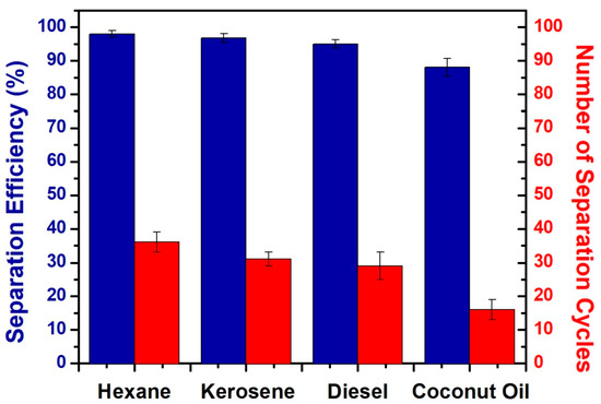 Separation efficiency and recycle ability of various oil–water mixtures by the superhydrophobic SP-3 pellet. Reproduced from [80], with permission from Elsevier, 2020.