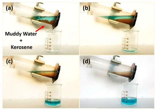 Muddy water—kerosene separation by superhydrophobic SP-3 pellet (a) before separation; (b) after 3 min of separation; (c) after 8 min of separation; (d) after 12 min of separation. Reproduced from [80], with permission from Elsevier, 2020.