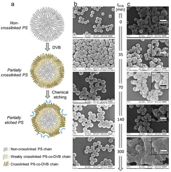 The particle shape was adjusted by tuning , as shown in Figure 3b,c. When DVB was added immediately after the initiator addition ( = 0 min), the particle shape remained intact after dispersing them in toluene, demonstrating that these PS NPs were completely crosslinked to form PS-co-DVB copolymer. When increased to 35 min and 70 min, the resulting particles’ surface was partially etched after solvent treatment. As further increased to 140 min, the non- or weakly crosslinked portions that could be chemically etched increased, resulting in a more significant degree of structural roughness. When DVB was added after the completion of polymerization (i.e., 300 min), the crosslinked regions of the PS NPs were minimally formed, resulting in unstable particles in toluene that formed aggregated clumps.