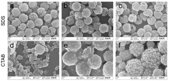 The morphological changes in partially crosslinked PS NPs ( 70 min) were further evaluated by treating them with different organic solvents. The study used SDS and CTAB surfactants in the polymerization reaction. When examining the PS NPs polymerized in the presence of SDS (Figure 4a–c), the use of THF and chloroform produced a similar morphology compared to toluene. In contrast, the PS NPs polymerized with CTAB were more vulnerable to solvent treatment (Figure 4d–f). When the particles were dispersed in THF, chloroform, or toluene, they formed aggregates and fused together, indicating that an inefficient crosslinking reaction occurred for 70 min.