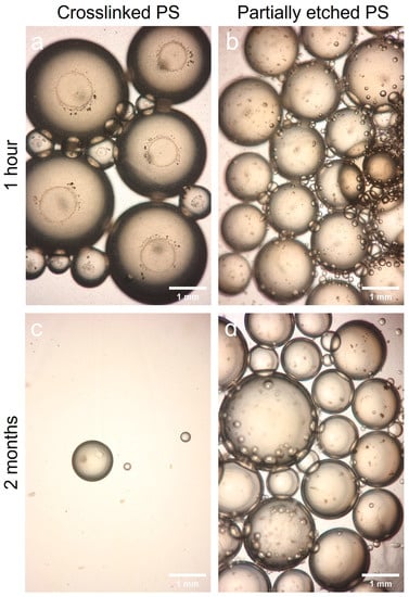In this study, we focus on developing a simple protocol to fabricate partially etched PS NPs using emulsion polymerization and chemical etching. The degree of crosslinking was controlled by adjusting the time to add a crosslinking reagent during the polymerization reaction. Then, the obtained partially crosslinked PS NPs were chemically etched to selectively dissolve weakly crosslinked portions. These particles with increased surface area were evaluated by using them as solid surfactants to form Pickering emulsions. Note that Pickering emulsions are stabilized by solid particles adsorbed at a fluid–fluid interface, which are more stable and robust than traditional emulsions stabilized by molecular surfactants [,]. Thus, developing solid surfactants with tailored properties is of great interest for the stabilization of Pickering emulsions. Our approach provides insights into the potential of partially etched NPs as solid surfactants in emulsion stabilization. Furthermore, the ability to control the degree of surface roughness and surface area of the NPs offers new opportunities for developing novel materials with tailored properties for various medical and environmental applications.