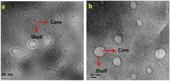 HR-TEM images of (a) 10 phr and (b) 20 phr epoxy/eSBS55 blends.