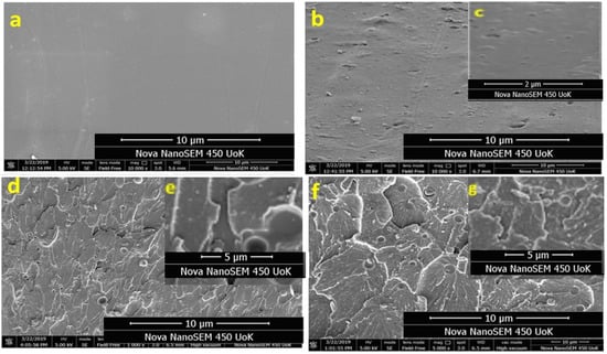 FE-SEM micrographs of fracture surface of (a) neat epoxy, epoxy/eSBS55blends with (b) 5 phr, (c) higher magnification, (d) 10 phr, (e) higher magnification, (f) 20 phr, and (g) higher magnification, respectively.