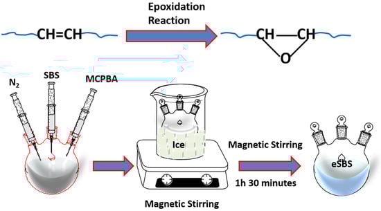 The epoxidized SBS with a varying epoxidation degree was prepared by using the MCPBA (metachloroperbenzoic acid) method in an inert atmosphere at 0 °C using Hukj as solvent according to our previous report [1,18]. A total of 1 g SBS was dissolved in 70 mL DCM, and stoichiometric amount of MCPBA was added into it. This was followed by magnetic stirring for 1 h 30 min. Scheme 1 represents the epoxidation reaction of SBS block copolymer. The maximum epoxidation degree, 55 mol wt% eSBS, was used for further studies.