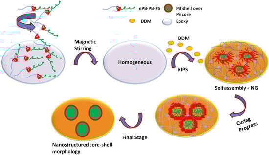 Schematic representation of the formation of nanostructured core-sell morphology in epoxy/eSBS55 blends system.