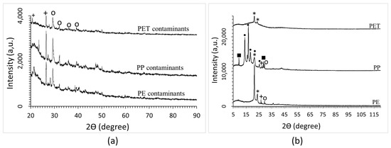 XRD of contaminants (a) and polymeric fractions (b): o = CaCO3, ■ = Mg3Si4O10(OH)2, + = SiO2, * = HDPE, • = PP.