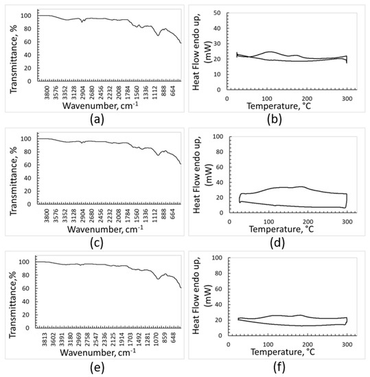 FTIR and DSC analyses of contaminants removed from: PE (a,b), PP (c,d), PET (e,f).