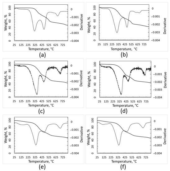TGA and DTGA (dotted line) curves of contaminants removed from plastic batches. Curves recorded under inert atmosphere: PE (a), PP (c) and PET (e). Curves recorded under air, PE (b), PP (d), and PET (f).