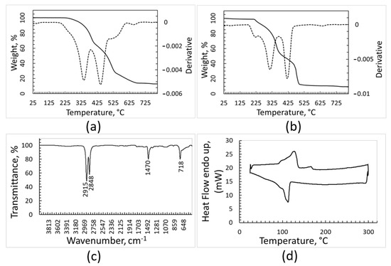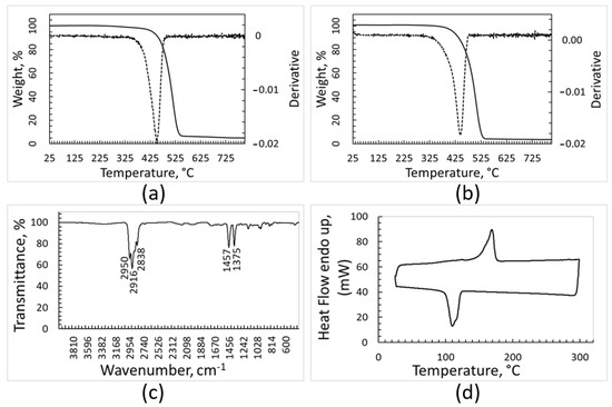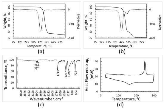 Characterization of the PE fraction: TGA and DTGA (dotted line) curves recorded under argon (a), TGA and DTGA recorded under air (b), FT-IR spectrum (c), DSC heating and cooling curves (upper and lower curve, respectively) recorded under nitrogen atmosphere (d).