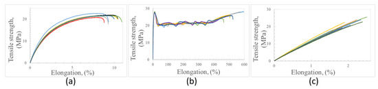 The stress–strain curves resulting from the tensile test of PE, PP, and PET samples produced by using 100% of recovered plastic fractions are compared in Figure 7. These curves show very different trends depending on the kind of polymer. Polyethylene at the beginning suffers elastic deformation, and afterwards, progressive plastic deformation till breakage. The elongation at the break of PE specimens was rather low. However, the presence of inorganic contaminants can cause a significant reduction in ductility.