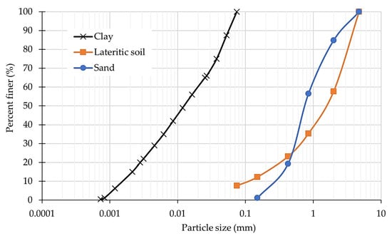 The lateritic soil was collected from the soil plant of the KG construction company, located in the eastern area of Saraburi province, Thailand (Figure 1b). The lateritic-soil sample was classified as clayey sand (SC) (ASTM D2487-17) [20], and the diameter of the largest particle was 2 mm. The particle diameter at 10% (D10), the particle diameter at 30% (D30), the particle diameter at 50% (D50), and the particle diameter at 60% (D60) were 0.1, 0.69, 1.70, and 2.05 mm, respectively. The minimum particle diameter (Dmin) was 0.075. The uniformity coefficient (Cu) and the coefficient of gradation (Cc) were 20.5 and 2.32, respectively. The distribution curve of lateritic soil’s particles is shown in Figure 2.