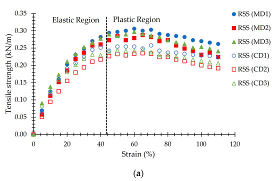 To increase the ultimate tensile strength of the RSS geogrid, the RSS was improved into a rubber compound sheet (RCS) by adding the chemicals to raw rubber, which was RSS in this study. The chemicals components of RCS were RSS, zinc oxide (ZnO), stearic acid, rubber antioxidant (6PPD), CaCO3-HI-CAL CC, carbon black N330, silica, polyethylene glycol (PEG4000), paraffin oil, sulfur, and rubber accelerator (CBS) as shown in Table 1. The thickness of the RCS was between 2.50 mm to 3.50 mm. The ultimate tensile strength of the RCS geogrid [23] was tested in both MD and CD, which were repeated 3 times as shown in Figure 3b. The average ultimate tensile strength and tensile strength at 2% strain on the MD were approximately 6.614 kN/m and 0.251 kN/m, respectively. While those on the CD were approximately 6.327 kN/m and 0.269 kN/m, respectively. The ultimate tensile strength of the geogrid was typically varying from 0.25 to 14.4 kN/m [24].