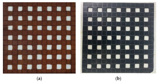 Material factors affecting the interface shear strength coefficient of soil reinforcement consisted of the angle between the geogrid and shear direction, aperture size, aperture area, maximum tensile strength, and junction strength of the geogrid [9,10]. Therefore, the angle between the geogrid and shear direction, aperture size, and aperture area of the RSS geogrids and RCS geogrids were set as the control factors for standard comparison. The aperture area of RSS and RCS geogrids was 400 mm2, which was designed as a biaxial geogrid in the shape of a square measuring 20 mm × 20 mm and a spacing of 20 mm. The properties of the RSS and RCS geogrids, including tensile strength at 2% strain and ultimate tensile strength, are shown in Table 2. In addition, the RSS and RCS geogrids are shown in Figure 4.