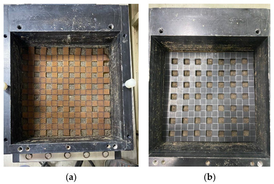 The RSS and RCS geogrids in the shear box: (a) RSS geogrid; (b) RCS geogrid.