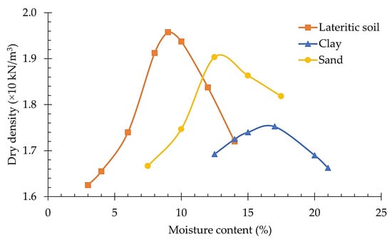 The shear strength of clay was the highest followed by lateritic soil and sand, respectively. The highest shear strength of clay was due to the clay sample being compacted at the optimum moisture content (15.77%), which is lower than the plastic limit (39.74%). This means that the clay sample was prepared in a solid state. The clay with low moisture (lower than the plastic limit) is tough. The shear strength and compressive strength of clay in this state are significantly higher than in other states [37]. In addition, the minimum relative diameter (Dmin/D50) of lateritic soil was lower than that of sand. The decrease of Dmin/D50 has a remarkable effect on increasing the shear strength [38,39].