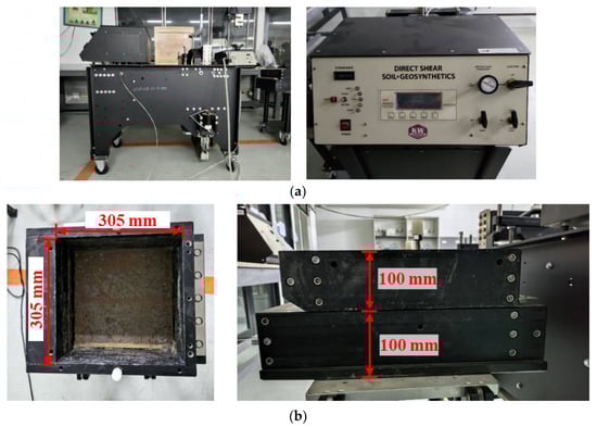 The horizontal force was applied to the lower shear box through the electrical jack that can control the displacement rate. The vertical stress was applied through a steel plate in a square shape with dimensions of 305 mm × 305 mm, which was plated on the top of the upper shear box. The steel plate was linked with an air-pressure pump to control the pressure, which was applied as vertical stress. The electrical sensors in the large-scale direct shear apparatus were used to measure and record real-time results, which were time, horizontal force, horizontal displacement, vertical pressure, and vertical displacement. The large-scale direct shear apparatus and the dimension of the shear box are shown in Figure 7a,b, respectively.