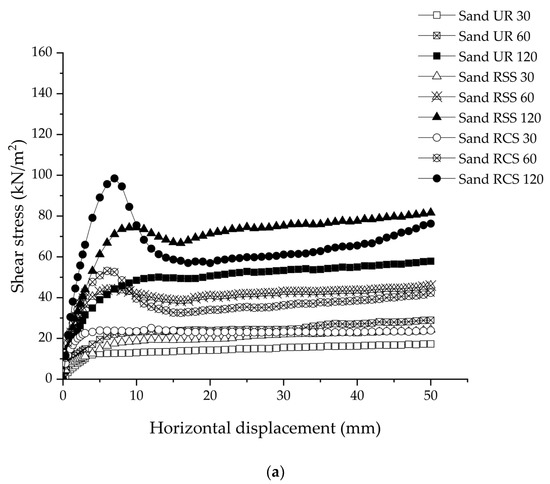 Figure 9 shows the relationship between the shear stress and horizontal displacement under the normal stress of 30, 60, and 120 kN/m2, respectively. The shear stress of sand increased rapidly until the maximum shear stress was achieved (Figure 9a). After reaching the peak, the shear stress decreased with an increase in the horizontal displacement. As a result, the rate of shear stress was linearly constant. The applied high-normal stress (120 kN/m2), the shear stress, and the horizontal displacement relationship presented the trend with shear stress as a bell shape, especially in the sand RCS sample. On the other hand, the peak points of shear stress or the bell shape were not observed in the sand UR samples and the sample under the normal stress of 30 kN/m2. The highest shear stress was 100.4 kN/m2 under the condition of Sand RCS 120. As a result, it was found that the occurrence of the bell shape graph in sand with RSS and sand with RCS presented the effect of RSS and RCS geogrids increasing the interlock between sand particles. This led to an increase in frictional resistance when the normal stress was applied to the sand sample.