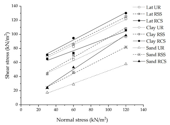 Table 4 shows that there is no obvious increasing trend in the strength development from cohesion to adhesion for all soil in this study, which is dependent on the interface between soil backfill and geogrid reinforcement. In the case of the sand, the adhesion between sand backfills and the RSS geogrid was 6.56 kN/m2, which was higher than the cohesion of ordinary sand (2.89 kN/m2). Whereas, the adhesion between sand backfills and the RCS geogrid was 1.27 kN/m2, which was lower than the cohesion of ordinary sand. The adhesion between lateritic soil backfills and the RCS geogrid (49.97 kN/m2) was higher than that of the RSS geogrid reinforcement (25.72 kN/m2), and cohesion of ordinary lateritic soil (28.19 kN/m2). With the clay-reinforced with RSS and RCS geogrids, the adhesion increased from 50.08 kN/m2 (ordinary clay) to 52.10 and 54.14 kN/m2, respectively.