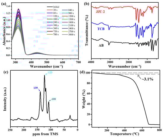 (a) UV-Vis adsorption spectra of azobenzene in dichloromethane under the irradiation with 365 nm light. (b) FT-IR of monomers and JJU-2; (c) 13C solid-state NMR (cyan 123, blue 139, green 108); (d) TGA of JJU-2.