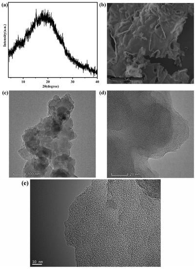 In addition, powder X-ray diffraction (PXRD) of as-synthesized POP reveals no diffraction peaks, indicating that as-synthesized JJU-2 is an amorphous solid material (Figure 2a). Using a scanning electron microscope (SEM) and transmission electron microscope (TEM), it is possible to observe the morphology and microstructure of JJU-2. The SEM image reveals that the prepared POP is an irregular crosslinked solid (Figure 2b). Moreover, the TEM images of JJU-2 demonstrate that the synthesized POP has a disordered, worm-like porous structure (Figure 2c–e).