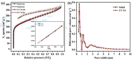 In order to examine the internal pores, synthesized JJU-2 is immersed in dichloromethane for two days and then activated at 150 °C for ten hours under a vacuum. The N2 sorption isotherms of the initial sample were measured at 77 K, and after 5 h of UV irradiation, they were measured at 77 K once more. As depicted in Figure 3a, the majority of the curves exhibited a type I isotherm with a substantial capillary N2 uptake in the low P/P0 region. It confirms that JJU-1 is microporous. The desorption curves of both materials showed little hysteresis due to the diffusional limitation of adsorbed N2 molecules in restricted micropores [54]. The sample surface areas are computed using the Langmuir and BET models, which are summarized in Table 1. Figure 3a and Table 2 demonstrate BET surface area plots. After 5 h of UV light irradiation, the surface area of the resultant material is smaller than that of the initial material. The NLDFT is utilized to determine the pore size distribution curves for both samples. After UV irradiation, the pore size distributions are between 0.50 nm and 1.27 nm, with a gradual decrease (Figure 3b). Similarly, the pore volumes of materials also undergo a change. Light-responsive azobenzene in the porous skeleton is primarily responsible for the pore change.