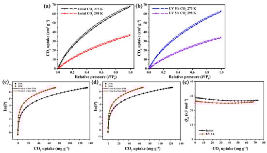 CO2 adsorption isotherms of (a) initial JJU-2 and (b) JJU-2 after UV irradiation for 5 h; the fitting data for calculating the CO2 Qst value for (c) JJU-2-initial and (d) JJU-2-1st UV; (e) the calculated Qst plots.