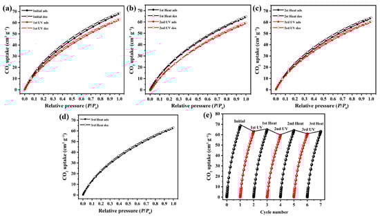 According to the porous structure of initial and UV-treated samples, the decreased micropore volume may be the main reason for reducing the CO2 adsorption capacity of JJU-2 after irradiating by UV light. Reversible circularity is another vital factor for stimulus-responsive CO2 sorption porous materials. As illustrated in Figure 5a–e and Table 4, the CO2 adsorption isotherms of JJU-2 are repeatedly measured for three cycles after UV irradiation and thermal regeneration, which exhibits that the as-synthesized JJU-2 has good light- and thermal-responsive circularity for adsorbing CO2 at 273 K under 1 atm under the controllable external stimulation.
