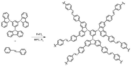 Based on our previous reports [48,49], we design and develop a carbazole-based azo-functionalized POP (JJU-2) by coupling 1,3,5-tris(9H-carbazole-9-yl) benzene (TCB) and azobenzene (AB) (Scheme 1). High stability, a large surface area, and well-developed pores characterize the prepared sample. In the meantime, the porous skeleton contains azo functional groups as a light-responsive sensitive component, resulting in stimuli-responsive CO2 sorption through cis and trans structure transformations under ultraviolet (UV) irradiation and heat treatments. Furthermore, the controlled CO2 sorption/release can be recycled at least three times without difficulty.