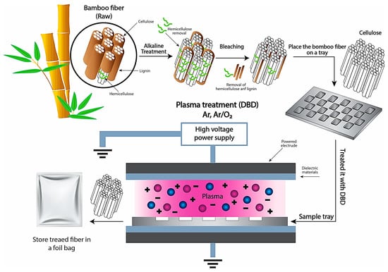 DBD plasma is one of the most effective nonthermal atmospheric plasmas; thus, it is preferred for low-voltage applications [29]. It is widely used for surface modification in the textile and polymer composite industries [30,31]. DBD is a class of plasma source that provides an insulating cover over the electrodes [32]. The specific advantages of atmospheric-pressure processing techniques, such as low-pressure treatment, offer much better stability, control, reproducibility, easy formation of a stable discharge and discharge scalability, and elimination of expensive vacuum equipment [30,33,34]. According to recent research, atmospheric plasma treatment is useful for modifying surface properties such as wettability, surface energy, and surface morphology without affecting the bulk properties of the material [35,36]. This surface modification method can remove lignin, hemicellulose, waxes, and other extractable substances, which increases the fiber surface roughness and contact area, thus improving the compatibility and interfacial adhesion between the natural fibers and the polymer matrix [37,38,39].
