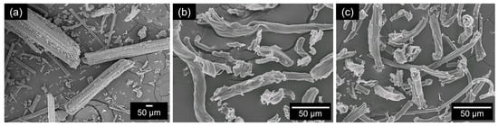 Figure 2 shows the macroscopic images of the bamboo at different stages: after the crushing process (Figure 2a), the pulp after the alkaline treatment process (Figure 2b), and the cellulose after the bleaching process (Figure 2c). Figure 2c clearly shows the micromorphology of the cellulose. The fiber particles consist of both irregularly shaped and long, stick-like fragments. The average size of the bamboo particles was 90 μm whereas that of the pulp after the alkaline treatment process was 60–50 μm, and that of the cellulose after bleaching was 10–50.4 μm. It was also observed that the cellulose fibers became thinner and cleaner after treatment with sodium hydroxide and chlorite solutions (Figure 2b,c), respectively.