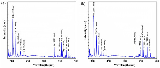 Representative OES of (a) argon gas and (b) Ar + O2 gas plasma.