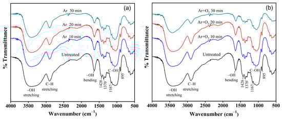 The FTIR spectra of the untreated and plasma-treated fibers are shown in Figure 4. The band in the region of 3200–3600 cm−1 is strong in cellulose and hemicellulose and corresponds to the hydrophilic hydroxyl (OH) stretching vibration [52,53]. The band at 2904 cm−1 is the C–H stretching vibration of the hydrocarbon structure in hemicellulose [54]. The band at 1640 cm−1 represents the adsorbed water molecules in noncrystalline cellulose. It is attributed to the H–O–H stretching vibration of the adsorbed water owing to the strong interaction between adsorbed water and the hydrophilic surface O–H group of cellulose because of the hydroxyl groups in cellulose [55,56]. The spectra at 1428, 1370, 1167, and 1056 cm−1 represent the C–H deformation (methoxyl group in lignin), C–H deformation (symmetric), C–O stretching of ester groups, and C–OH stretching vibration in cellulose, respectively [28,57,58,59]. The band at 895 cm−1 represents the C–H deformation in cellulose [60].