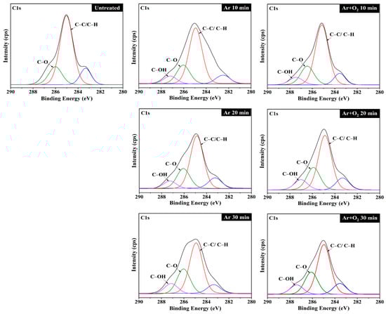 XPS analysis was performed to determine the elemental bonding of the carbon and oxygen atoms and to compare the energy levels and fiber intensities of the untreated and plasma-treated fiber samples (Figure 5). The XPS spectrum of carbon atoms on the fiber surface showed the highest intensity, where energy levels of approximately 285.0, 286.7, and 287.5 eV indicate the characteristics of C1s forming C–C or C–H, C–O, and C–OH bonds, respectively [8,62,63]. The C–OH bond is absent in the untreated plasma fibers, but it appears after the plasma treatment of the BFs. It was found that with every increase in treatment time, the intensity of the C–OH bonds increased, whereas the intensity of the C–C or C–H bond decreased because of the plasma etching of the hydrocarbon bonds in the fibers. Ar+ ions, which are highly energetic ionic species with sufficient energy to break the C–C or C–H bonds, subsequently react to form various oxygen functional groups on the treated fiber surface [61,64].