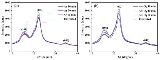 XRD diffractograms of untreated and treated BFs with (a) Ar gas and (b) Ar + O2 gas for various treatment times.