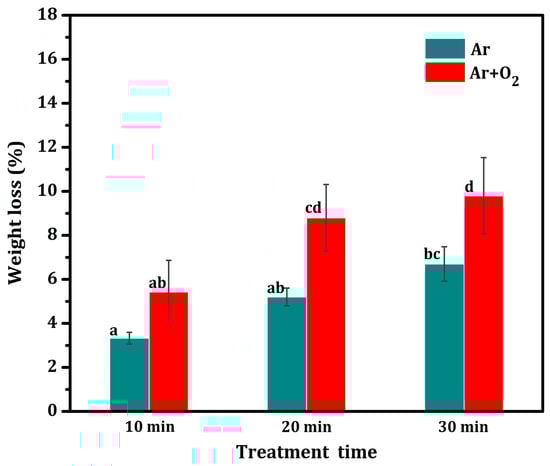 The weight of the treated fiber was significantly lower than that of the untreated fiber. Figure 7 shows the percentage of fiber weight loss versus treatment time for fibers treated with the two types of gas plasma. In the case of Ar gas plasma, the weight loss did not significantly increase with treatment time. The highest weight loss shown is 6.7% after 30 min, followed by 5.2 and 3.3% after 20 and 10 min, respectively. In the case of Ar + O2 gas plasma, the weight loss did not significantly increase with treatment time for 10 and 20 min, but it significantly increased with the 30 min treatment time. The highest weight loss was observed to be 9.8% after 30 min, followed by 6.6 and 4.2% after 20 and 10 min, respectively. This result can be attributed to the Ar plasma cleaning and slow etching of the fiber surface, whereas the Ar + O2 plasma etching was faster owing to the oxidation reaction of oxygen radicals, which resulted in oxidation of the fiber surface, thinning the fiber surface [1,66]. This result is consistent with the SEM results.
