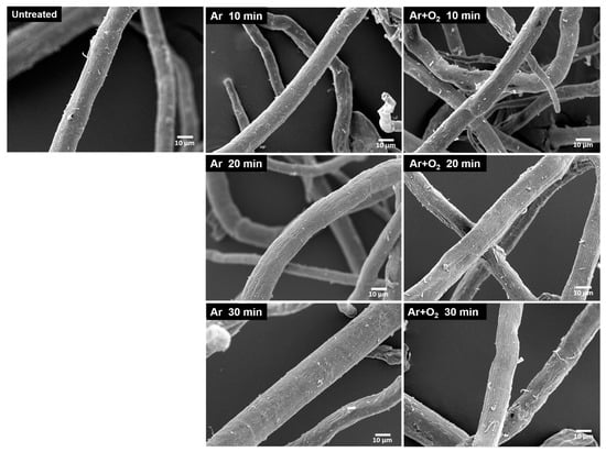 The morphologies of the untreated bamboo cellulose fibers and the fibers treated with different gas plasmas for various treatment times are shown in Figure 8 and Figure 9, respectively. The surface characteristics of the plasma-treated BFs are visibly different from those of the untreated BFs. The BFs treated with Ar and Ar + O2 gas plasma show partial etching of the fiber surface, which increased with increasing treatment time. The plasma treatment caused the etching of lignin and hemicellulose on the fiber surface, which was left over from the bleaching process, exposing the crystalline cellulose fibers. The plasma treatment with Ar + O2 gas resulted in more surface etching than that with Ar gas because of the oxidation–reduction of oxygen gas, which oxidized the fiber surface [67]. Furthermore, the fiber was composed of cellulose microfibrils linked with hemicellulose and lignin. When the lignin and hemicellulose were removed, microfibrils appeared in the cellulose, as shown in Figure 9, resulting in a higher surface roughness. The roughness and increased contact area improved the adhesion between the fiber and matrix interface, allowing the matrix to spread, penetrate, and interlock onto the fiber surface [28,68].