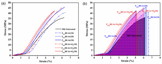Figure 10a shows the tensile properties observed using the tensile tester, where the FRE matrix composite fabricated using the untreated fibers was used as a control. The control showed tensile strength and elongation at a break of 36.94 MPa and 6.02%, respectively. The tensile strength, elongation at break, and energy absorption (EA) of the F(tr)RE composites fabricated using treated fibers were calculated and are reported in Table 6. The tensile strength of the plasma-treated F(tr)RE composites was significantly higher than that of the untreated composite (control). The tensile strength of F(tr)RE composites treated with Ar gas plasma increased with increasing treatment time; the F(tr)RE-Ar (30) composite exhibited a high tensile strength of 46.30 MPa. The Ar + O2 gas plasma F(tr)RE composites also showed a high tensile strength, particularly the F(tr)RE-Ar + O2 (10) composite, which decreased with increasing treatment time. Furthermore, the elongation at break of the F(tr)RE composites decreased as the treatment time increased, but it was not significantly different from that of the other treatments. The prolonged treatment time of the Ar + O2 plasma treatment affected the fiber structure, causing damage and cracking of the fiber. The oxidation reaction of oxygen gas resulted in the oxidation of the fiber surfaced, making it thinner, which led to the brittleness of the fiber [71]. The EA of the F(tr)RE composites during tensile strain is a highly desirable property, in addition to tensile strength. The EA was calculated from the area under the stress–strain curve, and the results are shown in Figure 10b. The EA of the Ar gas plasma F(tr)RE composites increased with increasing treatment time, in which the F(tr)RE-Ar (30) composite showed the highest EA of 129.22 MPa·mm/mm, which is a significant increase when compared with the FRE-untreated composite (98.25 MPa·mm/mm). Plasma etching of the fiber surface increased the roughness, resulting in better diffusion and penetration at the fiber–matrix interface and creating interlocking bonding [28,72]. Furthermore, Ar gas plasma cleaning of the fiber surface resulted in a decreased contact angle, which enhanced the polarity [73]. This improved the surface energy of the fiber surface, leading to good interface adhesion, allowing it to absorb energy and resulting in the gradual growth of cracks until final failure occurred by exceeding the fracture toughness [74,75,76]. Composites with a large area under the stress–strain curve are more effective energy absorbers. Therefore, the plasma-treated fibers improved the mechanical properties of the composite matrix. Although the EA of the Ar + O2 gas plasma F(tr)RE composites did not significantly decrease with increasing treatment time because of the brittleness of the fibers, the plasma etched the fiber surface, which thinned the fibers and led to the fracture.