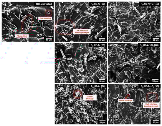 Figure 11 shows the fracture characteristics of the untreated fibers and the fibers plasma treated with Ar gas and Ar + O2 gas plasma for various treatment times after use as reinforcements in the epoxy composites. The plasma-treated F(tr)RE composites show better interfacial bonding between the treated fiber and the epoxy matrix than the FRE-untreated composite. The plasma discharge enhanced the migration of free radicals, which increased the cleaning and etching of the fiber surface, decreased the extent of voids in the composites, generated links between the two different material phases, and increased their interfacial adhesion properties [11]. The fiber surface etching with plasma treatment exhibited increased surface roughness, which improved the interfacial adhesion between the fiber and matrix because of the interdiffusion of molecules between the matrix and the fiber, resulting in an increase in the EA of the F(tr)RE-Ar samples. However, the interfacial bonding of the F(tr)RE-Ar + O2 composites decreased with increasing treatment time, and the oxygen plasma-treated fibers showed brittle breakage because prolonged etching of the fiber surface by plasma discharge caused thinning of fibers, and thus they fractured.