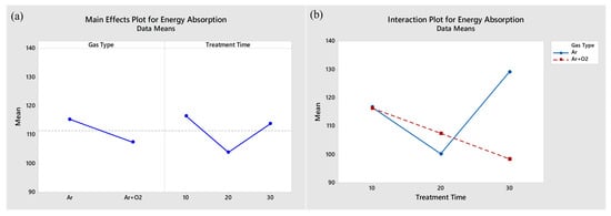 Figure 12a shows the two main factors influencing the response variable, EA. The effects of the gas type and treatment time on the EA values were not significantly different, but they did interact to affect the EA, as shown in Figure 12b. The EA value depends on the relationship between the gas type and treatment time. With increased treatment time, the mean EA of the Ar gas-plasma-treated F(tr)RE composites increased, whereas that of the Ar + O2 gas plasma-treated F(tr)RE composites decreased. The oxidation reaction of ROS resulted in faster etching and thinning of the fiber surface, which led to the brittleness of the fiber and the rapid propagation of cracks until final failure occurred.