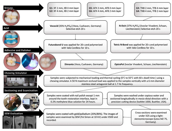 The teeth were immersed in an isotonic saline solution containing 0.1% thymol, and all residues were cleaned using an ultrasonic device, followed by fluoride-free paste and a rubber bur. The samples were then embedded in the molds of the chewing simulator using self-cure acrylic (Imicriyl, Konya, Turkey). Mesio-occlusal-distal (MOD) cavities (an occlusal isthmus of 3 mm in width/2 mm in depth and proximal boxes of 4 mm in depth/2 mm in wide) were prepared (as per standard protocol) with cervical margins 1 mm below the cemento-enamel junction (CEJ) on one side and 1 mm above the CEJ on the other. The cavities were prepared by a single researcher (A.A.Ş.) using round and inverted conical burs under water-cooling. A periodontal probe was used for the millimetric measurement of the cavity borders. The prepared teeth were randomly assigned into groups (Figure 1), and the restorations were completed by a single operator (A.A.Ş), in accordance with the manufacturer’s instructions (Table 1; Figure 2). The polymerization distance was standardized by positioning the tip of the curing device at a distance of 6 mm from the cavity floor at the distance allowed by the circumferential matrix band around the tooth. MOD cavities were polymerized from the center of each proximal box, assuming two separate Class II cavities.