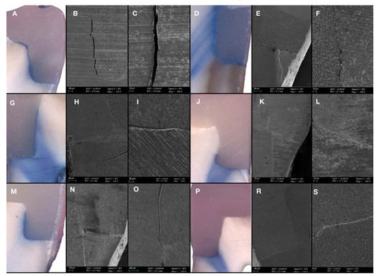 (A). Dye penetration of the sample restored with XF2 mm + XB4 mm (G1) (×25); (B,C) SEM micrograph of the marginal integrity of XF2 mm + XB4 mm (G1) (×120-×500); (D) dye penetration of the sample restored with XF4 mm + XB2 mm (G2) (×25); (E,F) SEM micrograph of the marginal integrity of XF4 mm + XB2 mm (G2) (×120-×500); (G) dye penetration of the sample restored with TNB2 mm + TFB4 mm (G3) (×25); (H,I) SEM micrograph of the marginal integrity of TNB2 mm + TFB4 mm (G3) (×120-×500); (J) dye penetration of the sample restored with TNB4 mm + TFB2 mm (G4) (×25); (K,L) SEM micrograph of the marginal integrity of TNB4 mm + TFB2 mm (G4) (×120-×500); (M) dye penetration of the sample restored with AFX2 mm + AFB4 mm (G5) (×25); (N,O) SEM micrograph of the marginal integrity of AFX2 mm + AFB4 mm (G5) (×120); (P) dye penetration of the sample restored with AFX4 mm + AFB2 mm (G6) (×25); (R,S) SEM micrograph of the marginal integrity of AFX4 mm + AFB2 mm (G6) (×120-×500).