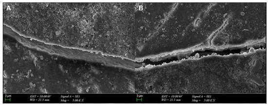 (A,B) Gap formation in the adhesive is observed in the SEM micrographs (×5000) of the samples from G2 (XF4 mm + XB2 mm) and G3 (TNB2 mm + TFB4 mm).