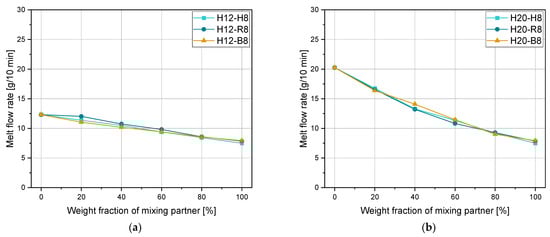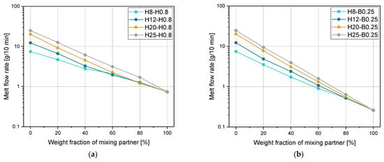 Melt flow rate depending on the weight fraction of (a) H0.8 and (b) B0.25 for H8, H12, H20, and H25.