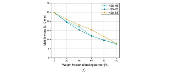 This section deals with the simultaneous adjustment of the MFR and various mechanical properties. Therefore, three homopolymers with different MFR values in the range of 12 to 25 g/10 min were modified with a lower MFR polymer (i.e., 8 g/10 min) of different types (i.e., homopolymer, random copolymer, or block copolymer). In Figure 2, the effects of MFR adjustment with 20% blending steps are shown in a linear scale for H12, H20, and H25 blended with the extrusion materials H8, R8, and B8, respectively. The blends in Figure 2a,b show overlapping results, and thus minor differences between the different PP grades are apparent in terms of flowability. Only the H20-B8 mixture showed slightly different values at some measurement points. In contrast, Figure 2c shows a clear difference between the different blending partners. The blends with the homopolymer and the random copolymer overlap again except for 40% H25-H8. However, the blends with the block copolymer show significantly higher values and almost linear mixing behavior in a linear scale, which has been interpreted as atypical so far. As reported in [], this behavior could be a consequence of heterophasic incorporated ethylene phases in the PP block copolymer. Furthermore, the used demolding agents could cause an unproportional increase in the MFR compared to the other samples. All calculated errors are given in Table 8. The bold number represents the best-fitting mixing rule for every single mixture. For the blends with H12, all three investigated mixing rules are sufficiently precise for the calculation. Therefore, for small MFR differences of both mixing partners, it is less critical to choose the best mixing rule for a good calculation of the MFR.
