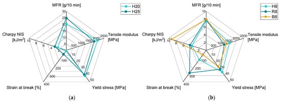 MFR and mechanical properties of (a) H20 and H25 and (b) H8, R8, and B8.