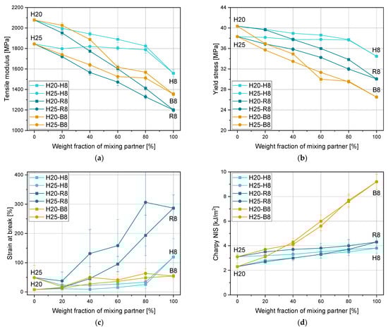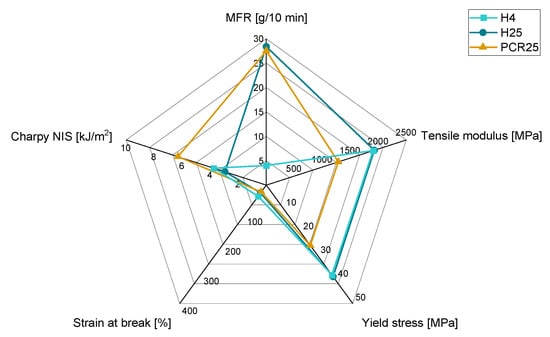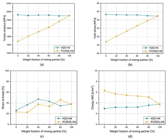In Figure 6, the modification of mechanical properties of H25 and PCR25 when mixing with H4 is shown. As there is almost no difference between H25 and H4 in terms of stiffness, an almost constant value of around 1900 MPa and 38 MPa for tensile modulus and yield stress, respectively, is shown in Figure 6a,b. The recyclate PCR25 initially has much lower pre-yield values of around 1300 MPa and 25 MPa for tensile modulus and yield stress, respectively. This allows for a much better property modification with a virgin homopolymer. A linear dependence of both properties with a of 0.99 could be derived. The similarity of strain at break values of all three materials led to only marginal changes with high standard deviations for pure materials and blends. The initial impact strength value of H25 is much lower than that of PCR25. The value of H4 is in-between those two materials. While in H25-H4, the value changes in a linear way depending on the mixing ratio, in PCR25-H4, the recyclate dominates the result of the mixture up to a share of 80% H4. Between 80% and 100%, a significant drop in the value occurs. This might come from macroscopic particles which are remaining in the recyclate, although the notch of the specimen ensures a targeted break. Therefore, it can be assumed, the cleaner the recyclates the better the modification of the impact strength by mixing with other materials. The corresponding spider diagrams are again shown in the Supplementary Materials as Figures S7 and S8, which show the possibility to change the MFR of a material with almost no change of the mechanical properties (H25-H4) and the adaptability of modifying the flowability and the mechanical properties of a post-consumer recyclate (PCR25-H4).