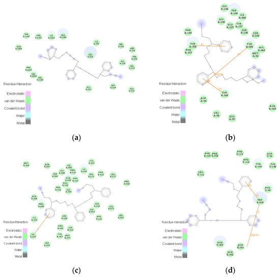 Studies have shown that MPs readily interact with cell membranes due to their hydrophobic nature and acquire favorable contacts with hydrophobic lipid tails, thus leading to MPs directly piercing through the membrane, then interacting with proteins in the cell []. The 2D distribution of important amino-acid residues of the AChR that binds to the 5-polymer SBR was mapped using freshwater nematodes, snails, shrimp, and freshwater fish, respectively, using the amino-acid residue-analysis tool of the Discovery Studio 2020 software (Figure 1). In all four organisms living in freshwater environments, van der Waals interactions predominated during the binding of AChR to SBR. The following amino acids were involved in the interaction: glutamic acid (GLU: hydrophilic), lysine (LYS: hydrophilic), phenylalanine (PHE: hydrophobic), threonine (THR: hydrophilic), isoleucine (ILE: hydrophobic), serine (SER: hydrophilic), glutamine (GLN: hydrophilic), methionine (MET: hydrophobic), glycine (GLY: hydrophobic), proline (PRO: hydrophobic), alanine (ALA: hydrophobic), valine (VAL: hydrophobic), aspartic acid (ASP: hydrophilic), tryptophan (TRP: hydrophobic), tyrosine (TYR: hydrophobic), histidine (HIS: hydrophilic), asparagine (ASN: hydrophilic), arginine (ARG: hydrophilic), and leucine (LEU: hydrophobic). During the binding of freshwater nematodes AChR to SBR, 18 amino-acid residues were involved in van der Waals interactions and 11 of those residues (61.11%) were hydrophobic (Figure 1a). When the snail AChR bound to SBR, 19 amino-acid residues were involved in van der Waals interactions (Figure 1b), of which 11 hydrophobic amino-acid residues made up 57.89% of the total. The binding of shrimp AChR to SBR involved 32 amino-acid residues, 23 of which were hydrophobic and accounted for 71.88% of the total number of van der Waals-interacting amino-acid residues (Figure 1c). When the freshwater-fish AChR bound to SBR, 13 amino-acid residues were involved in van der Waals interactions, and 8 were hydrophobic, accounting for 61.54% of the total (Figure 1d). Consequently, hydrophobic amino acids accounted for a large portion of SBR’s affinity for AChR and van der Waals interactions between molecules were responsible for producing hydrophobic interactions.