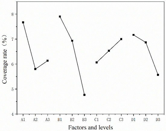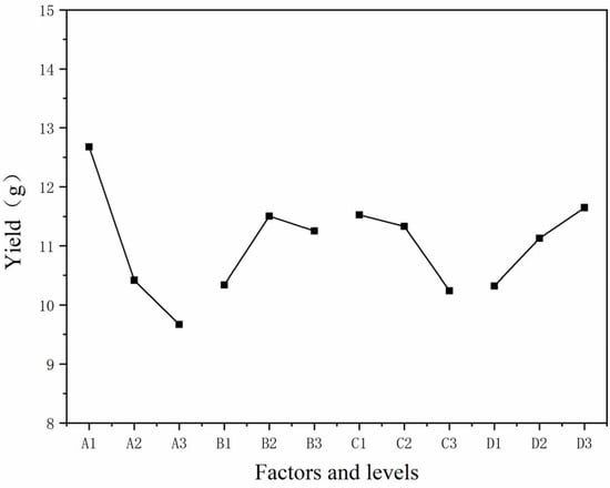 Table 7 reveals the analysis of the orthogonal test results of the microcapsule yield, and Figure 1 shows the visual analysis of each factor and level. The yield of sample 2 was the highest, reaching 13.55 g, followed by sample 1, reaching 11.77 g. Through a comparison of the mean value, the optimal level was determined to be A1B2C1D3. According to the comparison of the range results, the primary and secondary level of the influence of each factor on the microcapsule yield was A > D > C > B. The most influential factor was the molar ratio of urea and formaldehyde, followed by the stirring speed of microencapsulation, followed by the reaction temperature of microencapsulation, and finally the mass ratio of core material to wall material.
