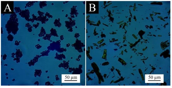 The micromorphology of the core material aloe-emodin powder and the urea-formaldehyde resin wall material powder prepared in this experiment is shown in Figure 3. Aloe-emodin appears as a long crystal because aloe-emodin itself is a large particle of dark orange needle-like crystal. The wall material appears as large irregular agglomerates because the urea-formaldehyde resin prepolymer itself has viscosity. After being ground into powder, the material particles are large, and there is still a large area of adhesion and aggregation.